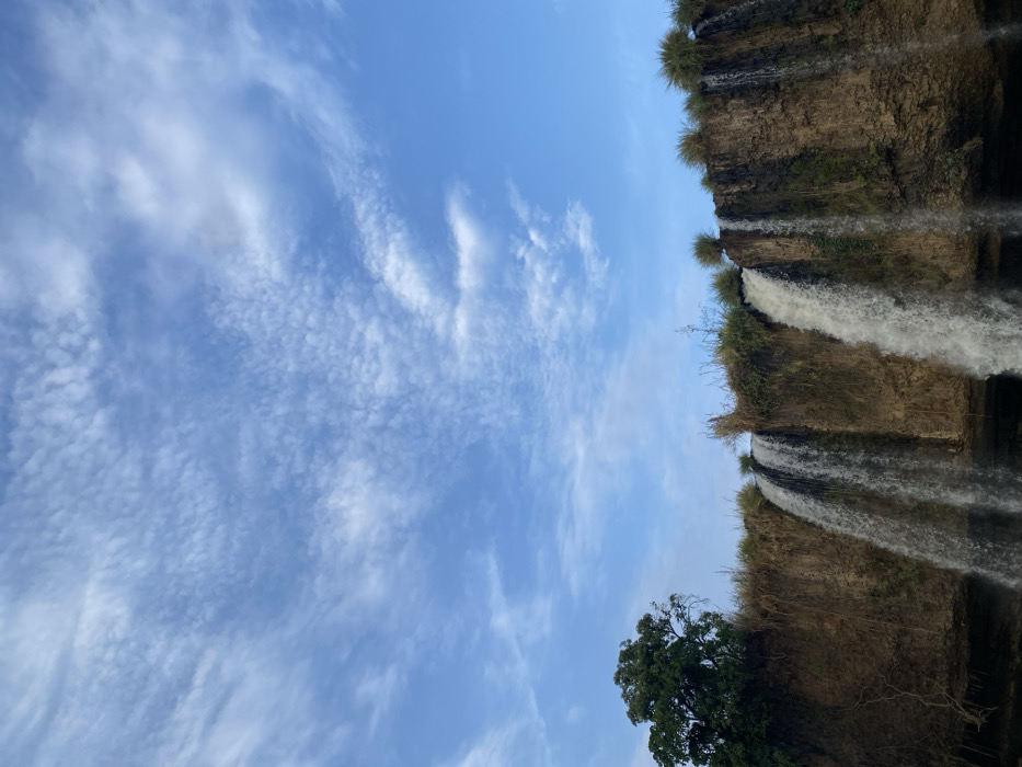 A waterfall cascades down a rocky cliff face overgrown with sparse vegetation. The water flows in separate streams, reflecting light. A tree grows at the cliff base. The sky is a brilliant blue with wispy, cirrus clouds scattered across the upper portion of the scene. The photograph appears to be rotated counterclockwise, giving a unique perspective.