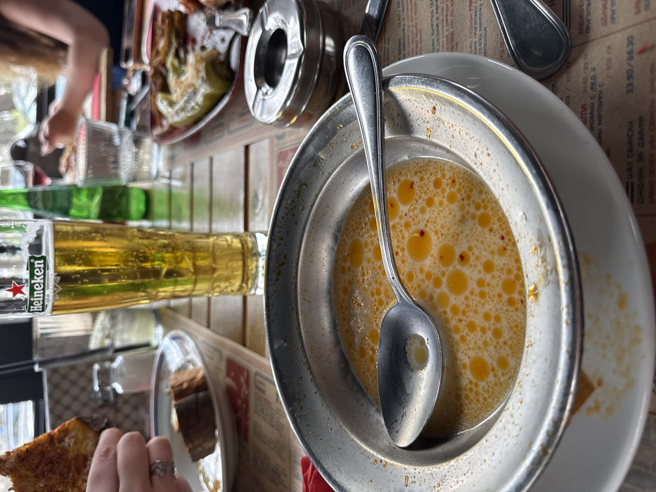 The image presents a close-up view of a dining table at a restaurant in Sofia, Bulgaria, taken from a low angle. In the immediate foreground, a metal bowl contains a creamy, yellow soup characterized by numerous small, orange oil droplets and scattered red spice flakes. A silver spoon rests in the soup, partially submerged. This metal bowl is nested within a larger white ceramic bowl, which sits atop a printed paper placemat or menu displaying Cyrillic text and prices. To the left of the soup, a hand with a silver ring on the index finger holds a piece of toasted, golden-brown bread or similar food item. Behind this hand, a white plate holds several slices of dark bread. A small, clear salt shaker is visible further back on the table. In the midground, a tall, clear glass of Heineken beer, approximately two-thirds full with visible condensation and effervescence, stands centrally. To its right, a green bottle, possibly containing water or another beverage, is partially obscured. Further to the right, a rectangular red-patterned plate holds various grilled food items, including at least two large green peppers topped with melted cheese or sauce. Adjacent to this plate, a round, silver ashtray is present. The background is softly blurred, revealing parts of another person's arm and light-colored hair, suggesting a second diner at the table. The table itself appears to be made of light-colored wood. The lighting suggests an indoor setting with ample natural light, possibly near a window or an open-air section of the restaurant.