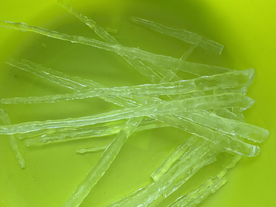 The scene, located in Matyushino, Russia, depicts a collection of approximately two dozen elongated, translucent objects against a uniform, bright lime-green background. These objects are irregular in shape, exhibiting characteristics consistent with crystalline or icy structures, possessing a pale greenish tint. Their lengths vary, ranging from approximately 2 cm to 10 cm. The objects display rough, uneven surfaces and irregular edges, with some tapering to points or exhibiting fractured ends. They are scattered and extensively overlapped, forming a dense cluster across the frame. No individuals, discernible actions, or interactions are present. The uniform green background appears to be an interior surface or container, providing a stark color contrast to the translucent subjects.