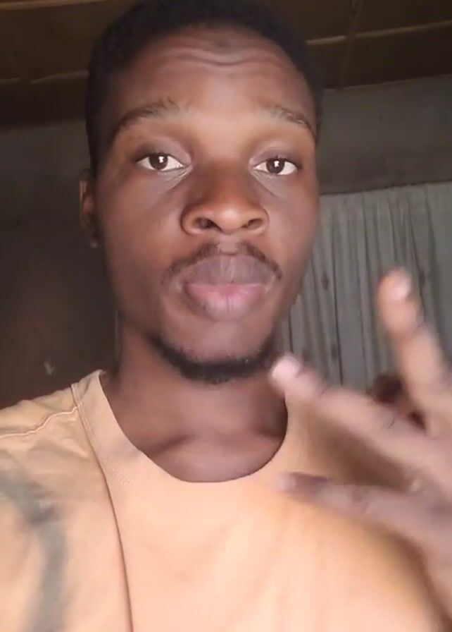 A young, Black man is centered in the frame, wearing an orange t-shirt. He's inside a room with a wooden ceiling and white curtains. He makes a peace sign, sticks out his tongue, and maintains direct eye contact with the camera. His expression alternates between neutral and serious.