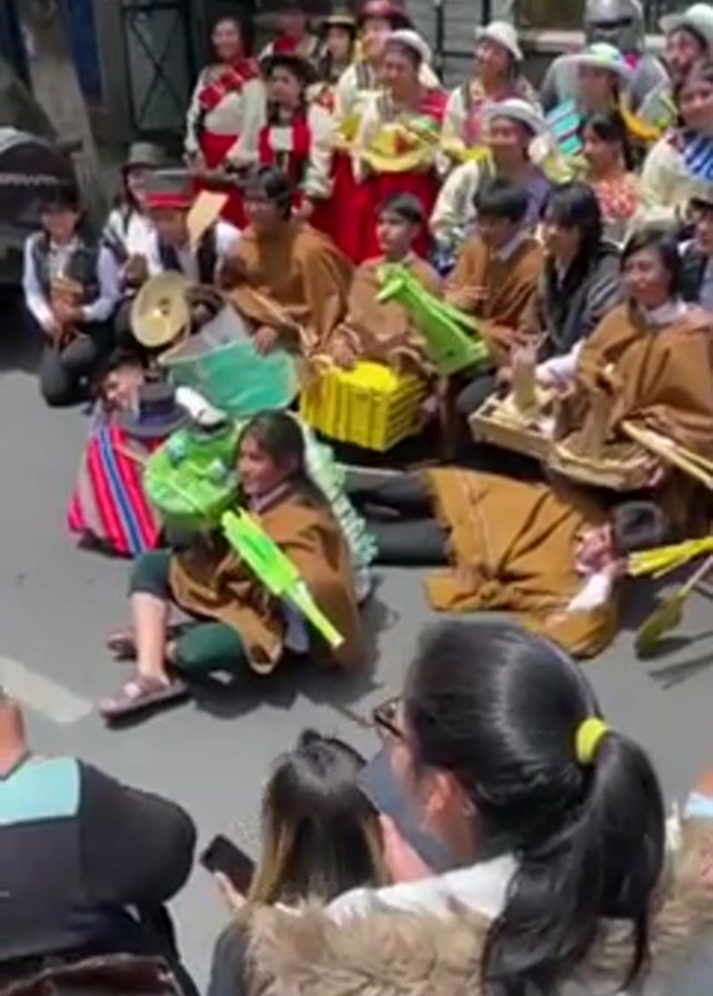 A crowd of people, mostly children and teenagers, in traditional clothing are gathered on a street. The children in the front are holding green or yellow objects, perhaps props for a performance. Some are lying on the ground. Adults stand behind them, also in traditional attire. People in the surrounding crowd are recording the scene with their phones. A drum is visible in the back.