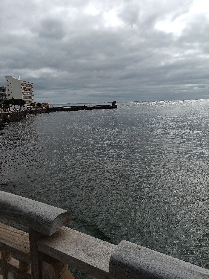 This image presents a coastal view in Agüimes, Spain, under an overcast sky. In the foreground, a weathered, light-colored wooden railing with a horizontal top rail and a lower support extends across the bottom of the frame, partially obscuring the immediate water below. The midground on the left features a multi-story building with a light-colored facade and multiple balconies, positioned along the shoreline. Adjacent to this building, a long, dark-colored concrete or stone pier/breakwater extends into the water from the coast towards the right, ending with a visible structure. The predominant feature of the midground and background is the dark grey ocean water, displaying numerous small ripples and reflections of the cloudy sky. The sky is entirely covered with thick, grey clouds, exhibiting some brighter patches. No individuals, explicit actions, or interactions are visible within the scene.