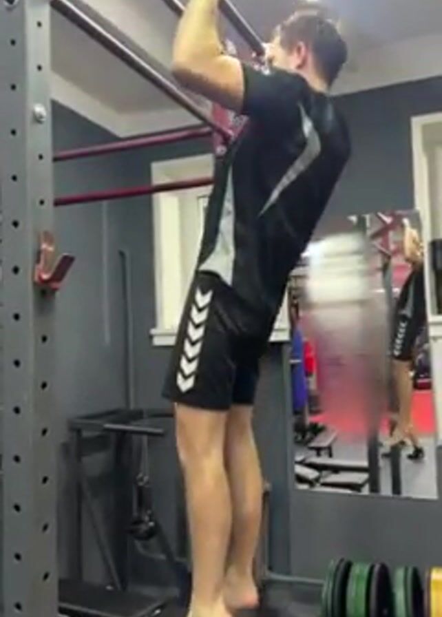A man is doing a pull-up on a pull-up bar in a gym