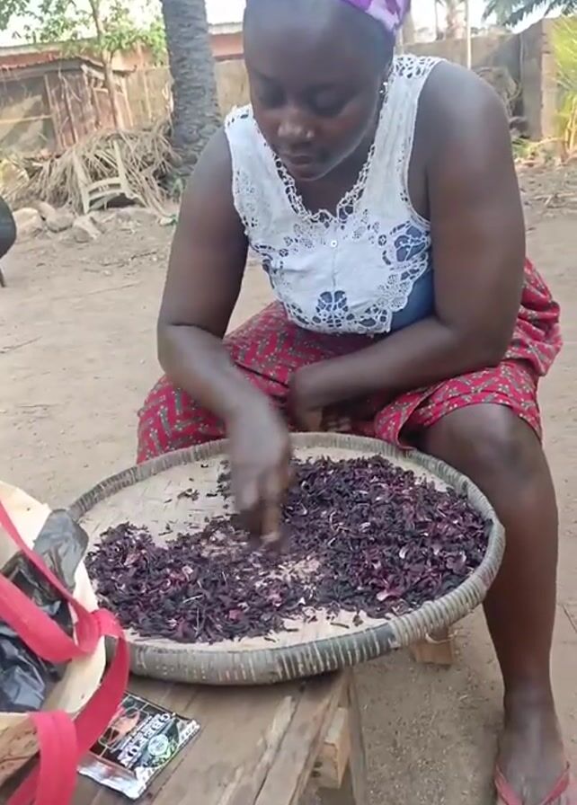 A woman is sitting on a low wooden stool outside. She is wearing a pink and purple headscarf, a white lace-trimmed tank top, and a red and green patterned skirt. She is sorting through dried hibiscus petals that are spread out on a large, round, woven tray. To her left is a black bag with red straps and a small packet of something. She is using her right hand to pick through the petals. The background includes trees, a house, and a sandy area.