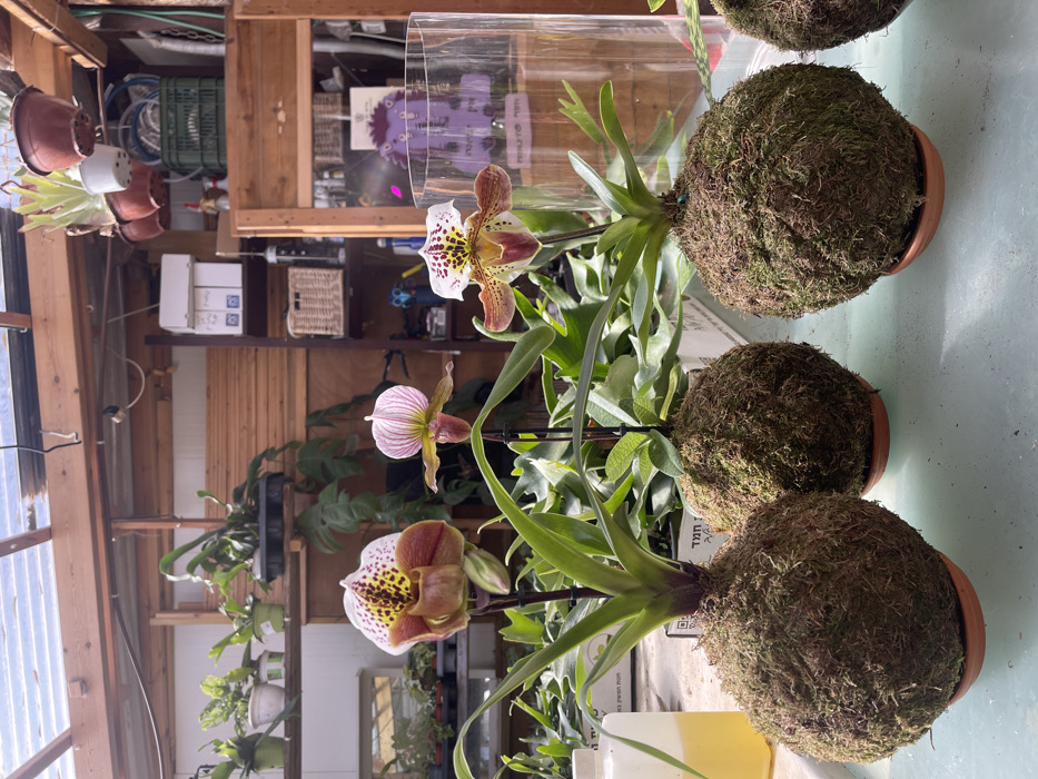The image displays an indoor plant cultivation area, likely a greenhouse or nursery, located in Pardes Hana-Karkur, Israel. In the foreground, four kokedama (moss ball) plant arrangements are positioned on a light-colored surface, possibly a display table. Three of these are fully visible, and one is partially cropped on the far right. The two leftmost kokedama prominently feature blooming Paphiopedilum orchids; the far-left orchid displays a large flower with mottled white, maroon, and yellow coloration, while the adjacent orchid has a smaller, pink-striped flower. Both orchids emerge from a cluster of green leaves at the top of their moss balls, which rest on small, terracotta-colored saucers. A translucent plastic bottle containing a yellow liquid is visible on the far left. The middle ground reveals additional plants in various containers and trays. A partially visible sign with Hebrew text, including "המט", is positioned between some of the plants. To the right, a clear glass cylindrical vase reflects a purple, stylized, monster-like graphic from an object behind it. The background consists of the greenhouse structure. The ceiling is translucent, composed of corrugated panels supported by wooden beams, allowing natural light to illuminate the scene. Wooden shelving units are prominent, holding various potted plants, some hanging, including what appear to be staghorn ferns. On the right, a multi-tiered wooden cabinet/shelf unit contains items such as wicker baskets, white cardboard boxes with blue square emblems, and other plant-related supplies. The overall environment suggests an active botanical display or sales area. No individuals are present in the image.
