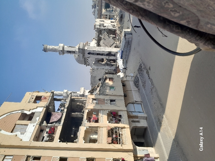 The image displays a scene of significant urban destruction in Khan Yunis, Palestinian Territory, under a clear blue sky. On the left, a multi-story, light-colored residential building shows extensive structural damage, with multiple floors partially collapsed, facades missing, and interiors exposed. Laundry, including red and dark garments, hangs from several damaged balconies. In the mid-ground, a white mosque with a prominent dome and a tall, slender minaret stands heavily damaged, exhibiting structural compromise and surrounding debris. The street in the foreground and mid-ground is paved but covered with scattered rubble and piles of debris. Two individuals are visible on the street: one person walks from left to right near large white container-like structures, and another stands further right, facing away from the camera. A patterned fabric and a black cable partially obscure the lower right foreground, indicating an elevated perspective.