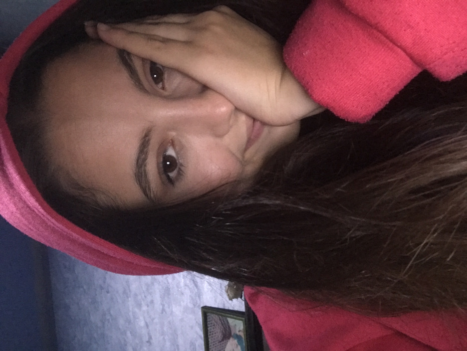 A person with brown eyes peeks out from under a raised hand, partly covering the face. The individual wears a pink hooded garment. Dark, long hair falls across the lower portion of the frame. The background includes a muted blue wall and a framed picture partially visible in the lower corner.