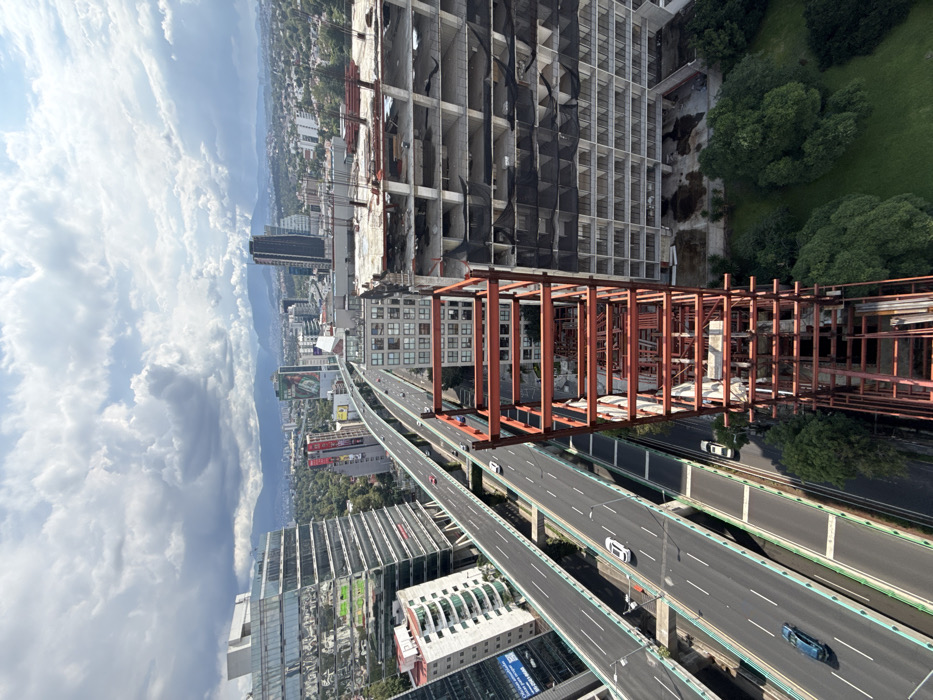 An aerial, high-angle view captures a segment of Mexico City, Mexico, under a partly cloudy sky. In the immediate foreground, a tall, reddish-orange painted steel structural framework, likely a core building element or support structure, ascends vertically, its base truncated by the frame. To the left of this structure, a multi-lane elevated highway system with a lower road level underneath traverses the scene diagonally from bottom-left towards the upper-center, carrying sparse traffic including white, silver, and blue vehicles. To the right of the steel framework, a large, multi-story concrete building appears to be in an advanced state of construction or deconstruction, with exposed floor slabs, support columns, and sections draped in black safety netting. Adjacent to this building, at ground level, are patches of dirt and green foliage. The background features a dense urban landscape comprising numerous high-rise buildings, including one with a reflective glass facade and another with a white, balconied design. Distant green hills and mountains are visible on the horizon beneath the extensive cloud cover. No individuals are explicitly discernible.