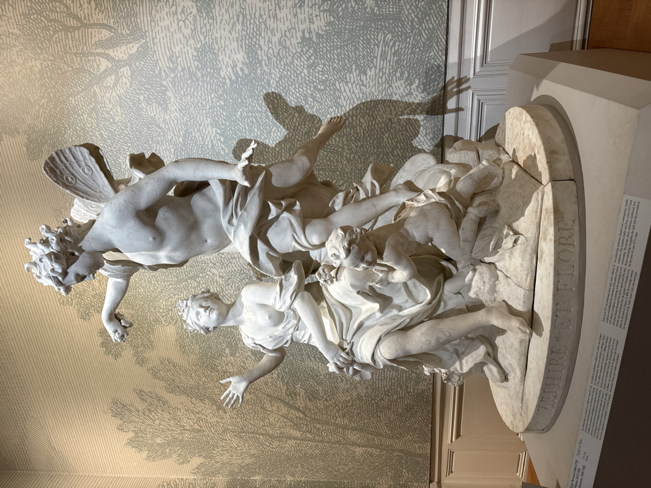 A large white marble sculpture group, titled "ZEPHIRE ET FLORE," is displayed indoors at the Château de Versailles, Versailles, France