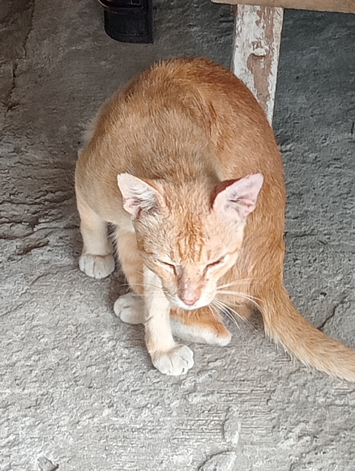 An orange tabby cat sits on gray concrete with its eyes nearly closed. The cat's fur is smooth, and its paws are neatly arranged. A slender tail extends from the cat's back. A black object and a partially visible, weathered wooden post are in the background, adding depth to the scene. The cat is the focal point, bathed in natural light.