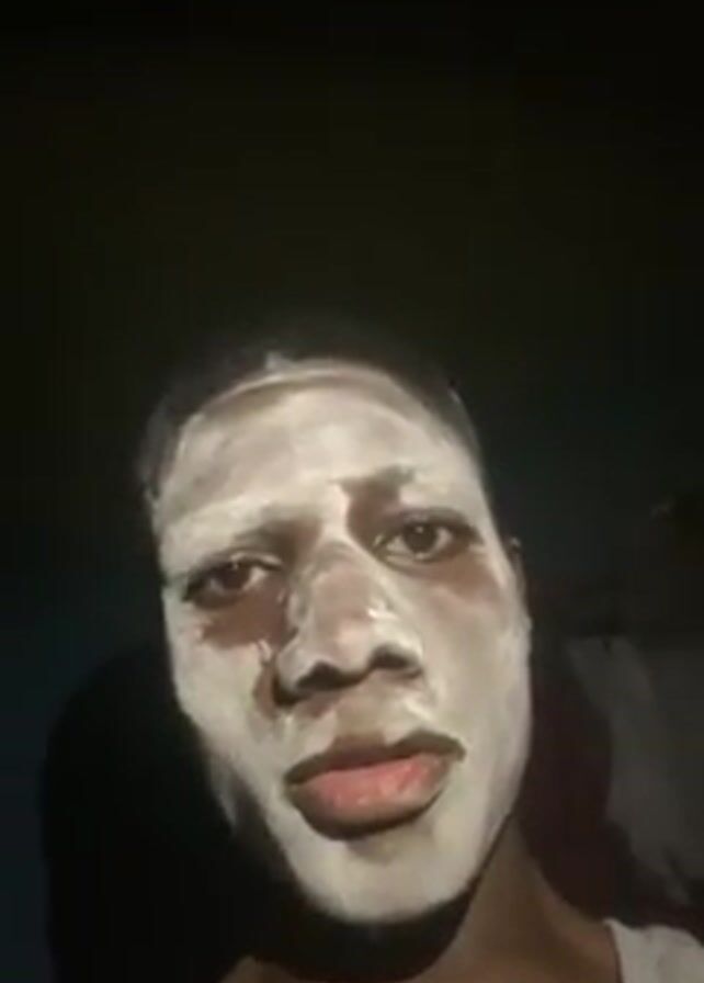 A person with dark skin and white cream covering their face looks at the camera and says "Eu vou cagar duro no cu