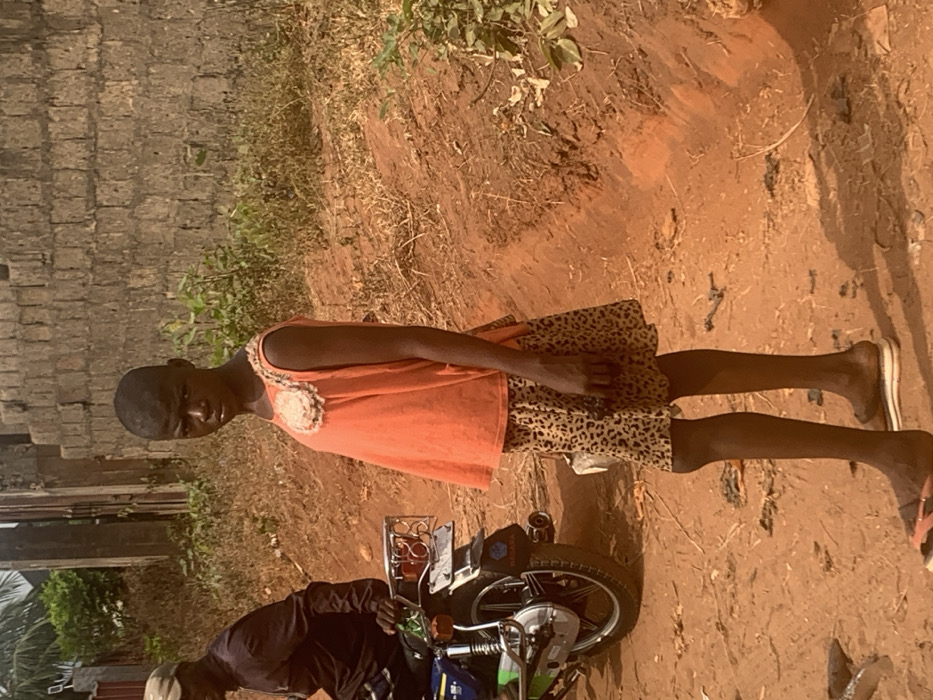 The scene, located in Aguleri, Nigeria, is an outdoor environment characterized by reddish-brown unpaved earth. In the foreground and center, a young individual with dark skin and a short-cropped hairstyle stands, directly facing the camera with a neutral expression. This individual wears an orange sleeveless top featuring a large, light-colored floral or rosetted embellishment on the left shoulder/chest area, paired with a short, A-line leopard-print skirt. Flat, open-toed sandals, one with a visible white platform sole, are worn on the feet. To the left and slightly behind this individual, a male figure is partially visible, seated on a green and blue motorcycle. He wears a dark long-sleeved shirt and a light-colored baseball cap, with his head turned away from the camera. The motorcycle's chrome rear rack, rear wheel, exhaust pipe, and a mudguard with a "NAGARA" sticker are discernible. The background features a horizontal wall constructed from light grey concrete blocks to the right, and sparse, dry vegetation with some green shrubbery scattered across the earthen ground.
