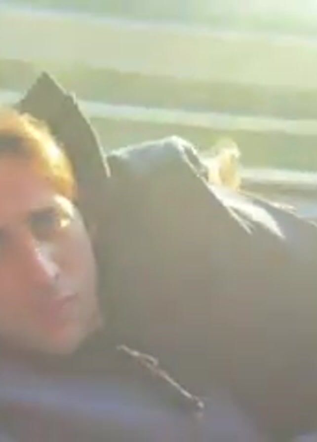 A young man with brown hair lies reclined in a seat, possibly on a bus or train, looking directly at the camera with a neutral expression