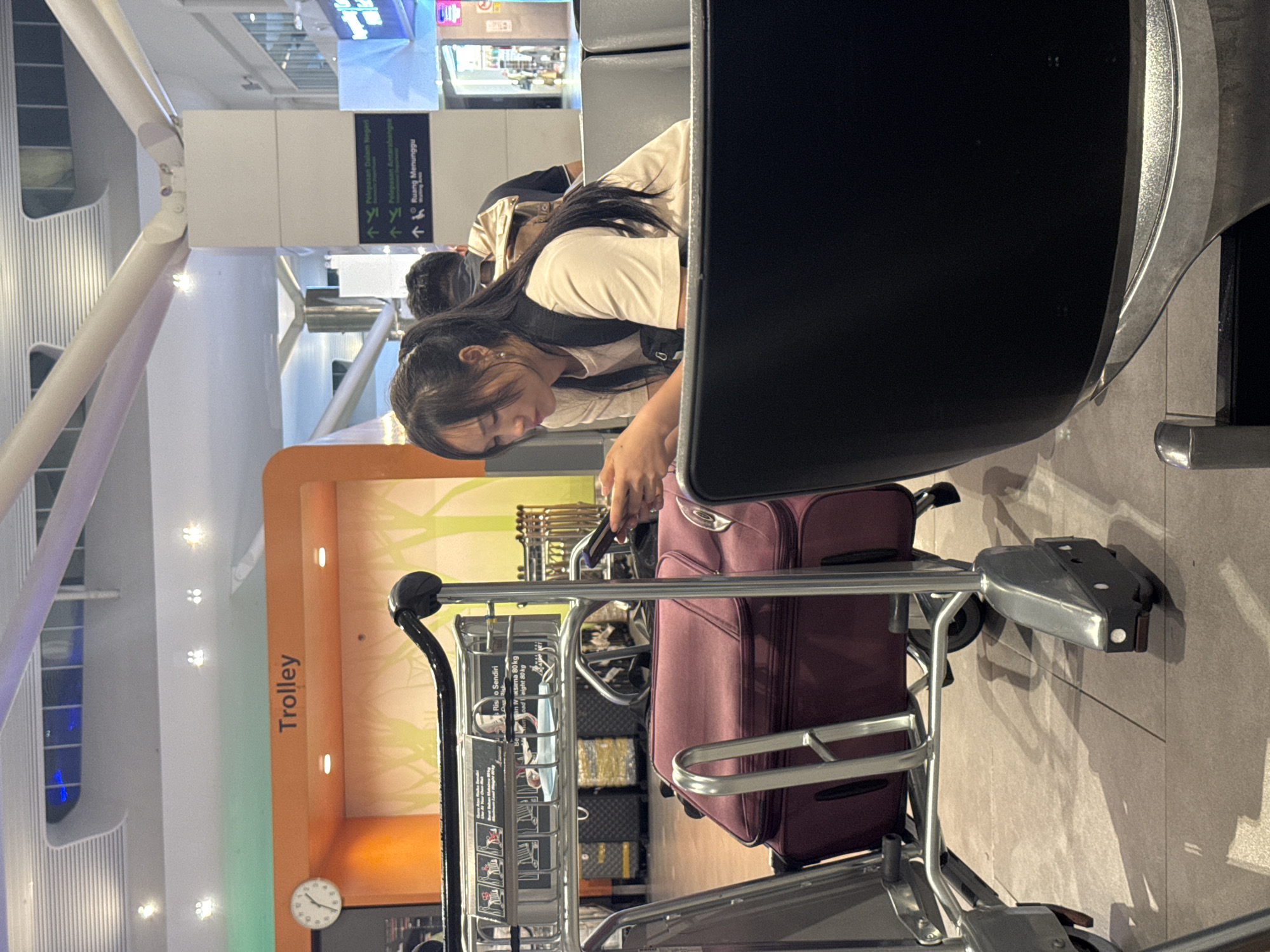 The image displays an indoor scene within an airport terminal, identified as being in Sepang, Malaysia, likely Kuala Lumpur International Airport (KLIA) or KLIA2, based on visible signage in Malay for "Pelepasan Dalam Negeri" (Domestic Departure), "Pelepasan Antarabangsa" (International Departure), and "Ruang Menunggu" (Waiting Area). In the mid-ground, a young East Asian female, appearing to be in her late teens or early twenties, is seated on a grey upholstered airport bench. She possesses long, dark hair tied into a ponytail with bangs framing her face, and wears a light-colored short-sleeved t-shirt and a dark backpack over her right shoulder. She is observed actively using a mobile phone held in both hands, her gaze directed downwards at the device. A small earring is visible in her left ear. To her right and partially obscured, the back of a male individual with a beige backpack is visible, also seated. The left foreground is dominated by a silver-colored metal airport luggage trolley with black handles. A maroon soft-sided suitcase rests on the trolley's lower platform. A sign attached to the trolley's upper basket provides information including a "Maximum Load Weight 80 kg" in both Malay and English. A second trolley is partially visible further in the background on the left. An orange cuboidal structure in the background features the word "Trolley" in white capital letters and a round analog clock displaying approximately 10:10. The background of this structure is decorated with a stylized light green and orange graphic resembling trees. The environment is brightly lit by various artificial overhead fixtures, and the floor is composed of light-colored tiles. White structural pillars and beams are evident, and blurred outlines of retail establishments are visible in the far background.