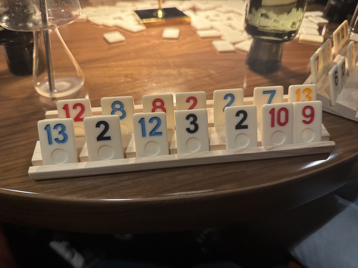 A wooden rack filled with Rummikub tiles sits on a round, brown wooden table
