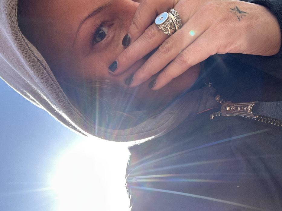 The image presents a close-up, backlit portrait of an individual in Weymouth, United Kingdom. The upper left quadrant features a clear blue sky and intense sunlight, creating significant lens flare. The subject, likely female, is wearing a dark jacket with a prominent metallic zipper and a light-colored hooded sweatshirt underneath, with the hood pulled up. The subject's right hand, which has dark nail polish on the visible fingernails, is raised and partially obscures the lower left side of their face. One eye is visible and directed towards the camera. Three rings are worn on the fourth finger of the right hand: a silver-toned ring with ornate scrollwork and a light blue oval-shaped stone featuring a dark cross or compass symbol, a second band encrusted with small, clear stones, and a plain bottom band. A small, black, stylized compass rose tattoo is visible on the back of the right hand, near the base of the index finger.