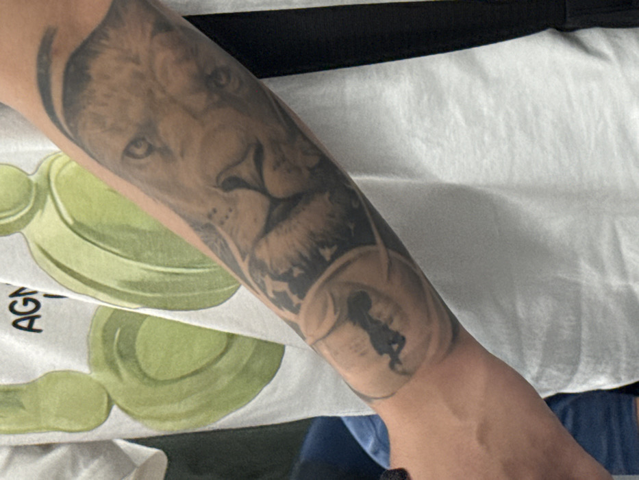 - "A human forearm, bearing a black and grey tattoo, is depicted in the foreground" by FM-LQg7b2, licensed under CC BY 4.0