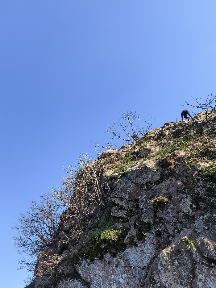 The image captures a steep, rocky hillside under a clear blue sky, situated in Ustina, Bulgaria. The lower and central portions of the frame are dominated by a rugged rock face, exhibiting mottled grey, brown, and reddish hues, with interspersed patches of green moss and sparse, bare deciduous vegetation. In the upper right quadrant of the rocky slope, a single individual dressed in dark clothing is visible, positioned in a bent-over posture, appearing to scramble or climb upwards. A small, simple cross, possibly wooden or metal, is partially visible on the rocky terrain slightly to the left and below the individual. The overall environment suggests an outdoor, natural landscape under bright daylight conditions.