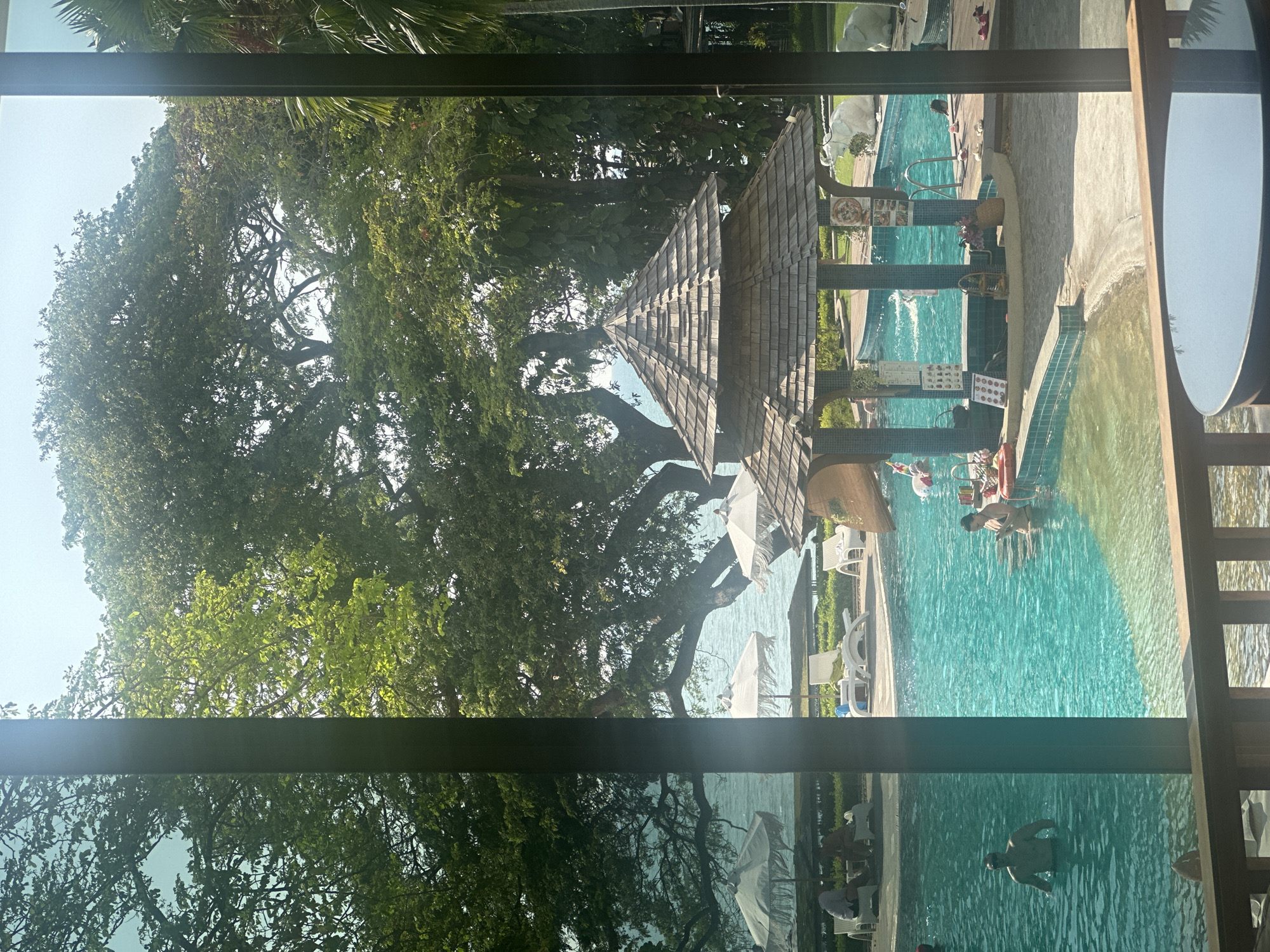 n outdoor swimming pool complex at a resort or hotel in Pattaya City, Thailand. The view is framed by a window or doorway, with a metal beam running across the top and another at the bottom of the frame. Lush green trees dominate the left side of the image, partially obscuring the view. The pool area features multiple interconnected pools with clear, turquoise water. A wooden gazebo-like structure with a tiled roof stands at the pool's edge. Several people are visible in the pool, engaging in swimming and wading. There are lounge chairs and umbrellas along the pool deck. Various signs and decorations are placed around the pool area.