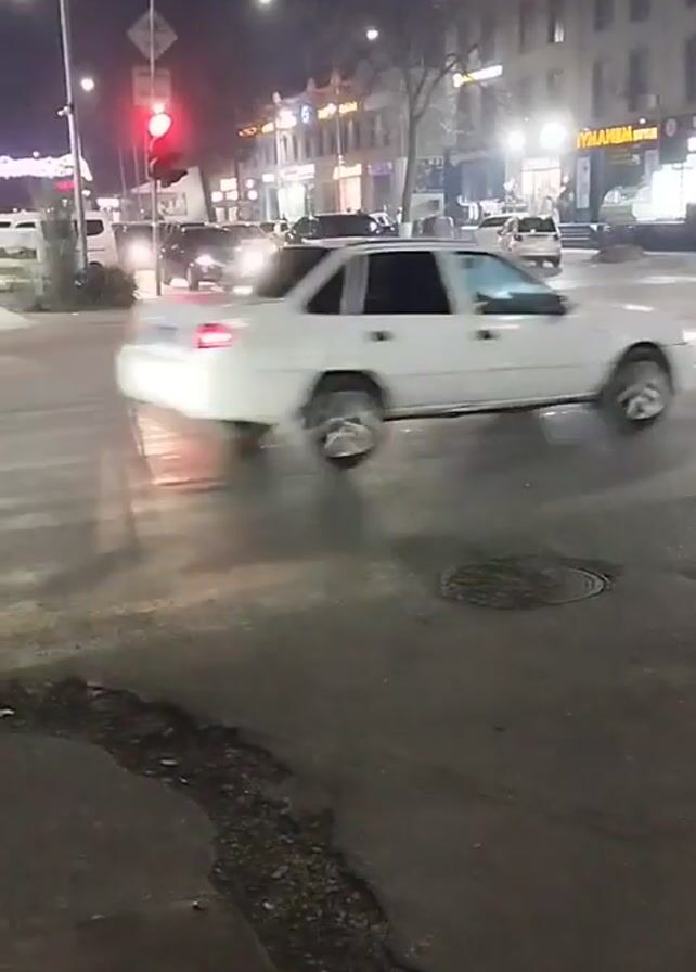 nighttime intersection scene. Cars move through the wet streets with their headlights reflecting on the pavement. Buildings line the streets with lighted storefronts. The traffic light is red in one direction. A manhole cover sits in the road.