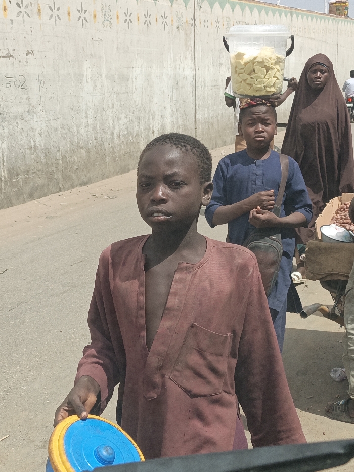 The image depicts an outdoor street scene in Fagge C, Nigeria, under bright daylight