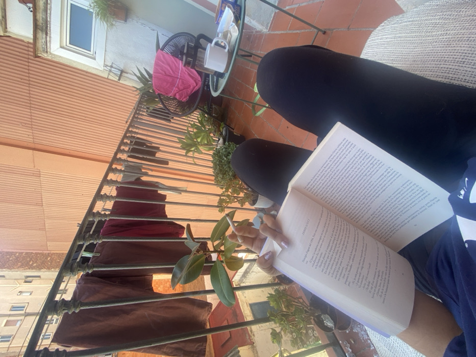 The image depicts a first-person perspective from a residential balcony in Barcelona, Spain, on a sunny day. The occupant, wearing dark trousers and a dark shirt, is seated, holding an open book with visible text in a Romance language (likely Spanish or Catalan) in the left hand. The right hand holds a lit cigarette between the index and middle fingers, displaying manicured nails with glitter polish. The balcony features a terracotta-tiled floor and a black metal railing from which laundry, including dark trousers and a red shirt, is drying. Several potted plants are arranged along the railing. To the right, a small round metal table holds a white mug and a clear glass pitcher. Behind the table, a black woven outdoor chair is partially visible, draped with a pink cloth or garment. The backdrop consists of a tall building wall, light orange in color, with a corrugated texture, suggesting a facade. A white-framed window is visible on an adjacent building wall to the right. Below the balcony railing, a view of another building or courtyard with concrete and some greenery is discernible, indicative of an urban environment.