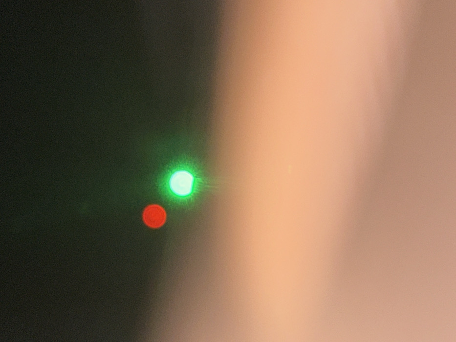 A blurred image showcases a dark background contrasted sharply with a lighter, peach-colored area. Two circular lights are visible on the dark side. The upper light is green, while the lower light is red. Both lights are slightly out of focus, contributing to the overall soft and indistinct quality of the image.