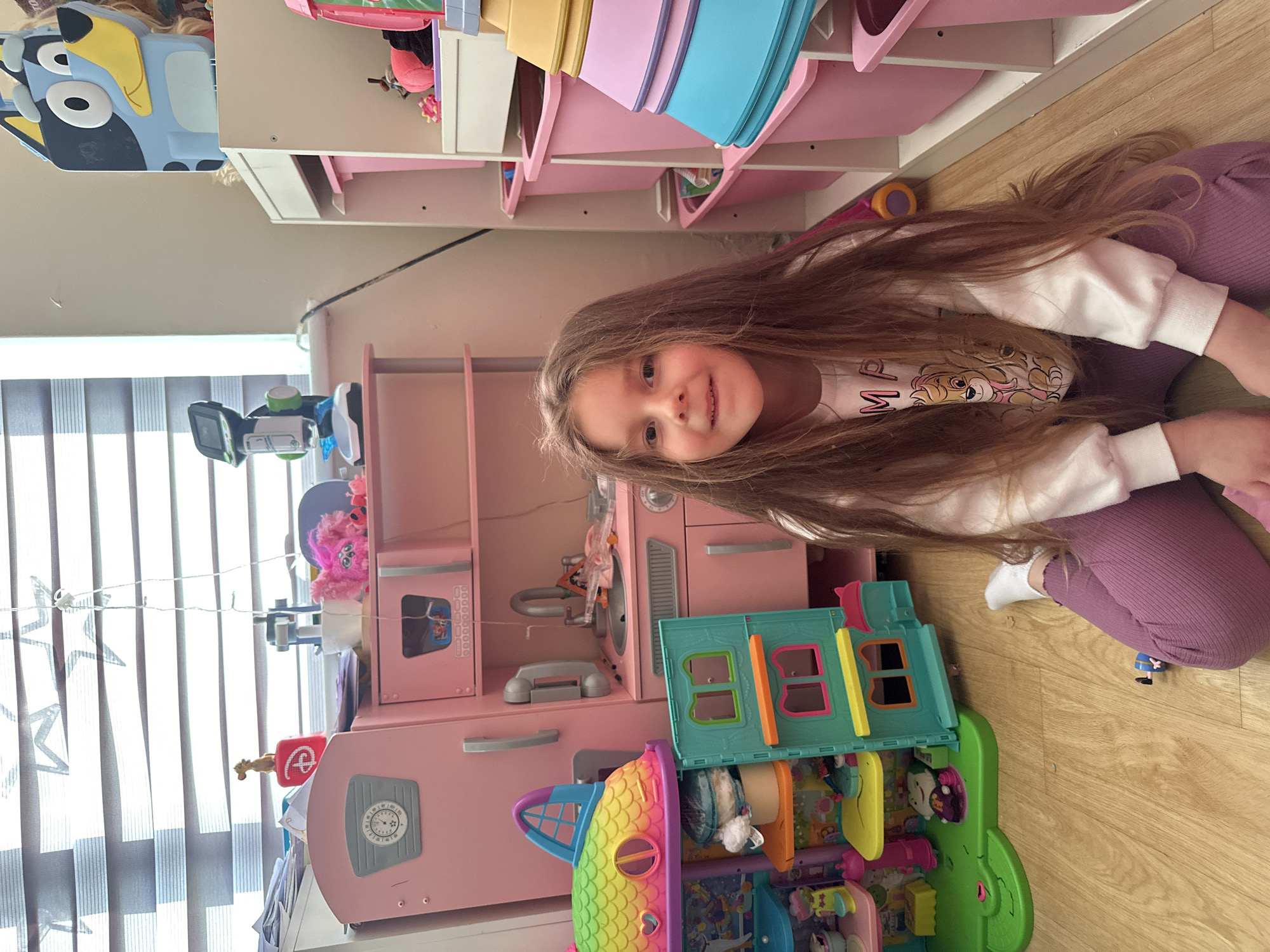 This image depicts a domestic interior, specifically a child's play area or bedroom, located in Maidstone, United Kingdom. A single female child, approximately 5-7 years old, is seated on a light-colored wooden floor in the foreground, facing directly towards the camera with a slight smile. She has long, straight, light brown hair. She wears a white long-sleeved top featuring a cartoon dog graphic (Skye from Paw Patrol) and ribbed purple leggings. White socks are visible on her feet. To the child's left, on the floor, are two multi-level toy structures: one with a rainbow-scaled roof and another teal-colored dollhouse. Behind these toys, positioned against a light-colored wall, is a large pink toy kitchen set, detailed with a refrigerator section (displaying a circular gauge), an oven, and a sink with a faucet. In the background to the far left, a window with horizontal blinds, featuring star-shaped cutouts, allows ambient light into the room. On a surface below this window, a pile of papers, a red container with a 'D' logo, a small figurine resembling Timon from The Lion King, and a green and white toy microscope are arranged. To the child's right, a white shelving unit is present, housing multiple pink storage bins. On top of this unit, a large blue and black toy resembling the character Bluey stands, alongside a stack of colorful plastic nesting bowls. A small blue and white toy figure lies on the wooden floor near the child's right knee. A string of white fairy lights hangs near the window, and a black electrical cable descends the wall adjacent to the window.