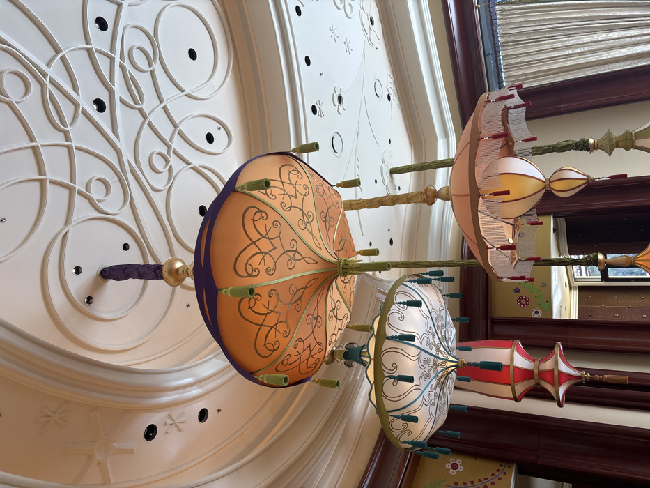 An interior photograph showcases three distinct, elaborately decorative chandeliers suspended from a multi-tiered, white ceiling within the Bellagio Hotel & Casino in Paradise, Nevada, United States of America. The ceiling features intricate recessed relief patterns, including spirals, abstract swirls, and star-like and floral motifs, along with multiple recessed light fixtures. The dominant central chandelier is umbrella-shaped, rendered in orange with dark purple trim, gold scrolled patterns, and green tassels, hanging from a purple fabric-wrapped shaft. To its lower left, a second umbrella-shaped chandelier is white with teal trim, teal scrolled patterns, and teal tassels, with a tiered red and white striped lantern component beneath. To the lower right, a third umbrella-shaped chandelier appears in light peach/pink with maroon trim, maroon tassels, and beaded fringe, incorporating a tiered light yellow lantern component. All chandeliers feature gold-colored finials and shafts. The background displays dark wood paneling, sections of yellow wall adorned with simple floral and leaf designs, and light-colored pleated curtains visible through an opening on the right. No individuals are present in the scene.