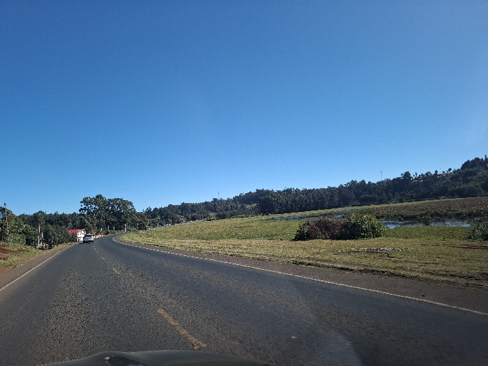 paved road curving to the right. There is a single white car driving in the distance on the right side of the road. There is a grassy area on either side of the road. The road is in Limuru Town, Kenya, at latitude: -1.104 and longitude: 36.63. The sky is a clear blue with no clouds. There are trees on both sides of the road. The vegetation consists of grass and trees. There are no other people visible in the image.