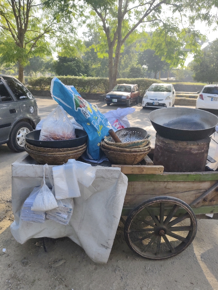 A street food vendor's cart is loaded with supplies. A large wok rests atop a cylindrical stove. Baskets hold ingredients, covered with plastic bags. A blue bag sits amongst them. The cart is wrapped with a white cloth. A single wooden wheel is visible, suggesting a vintage or handcrafted design. Cars are parked in the background, indicating an urban or semi-urban setting. Trees line the road, providing a natural backdrop.