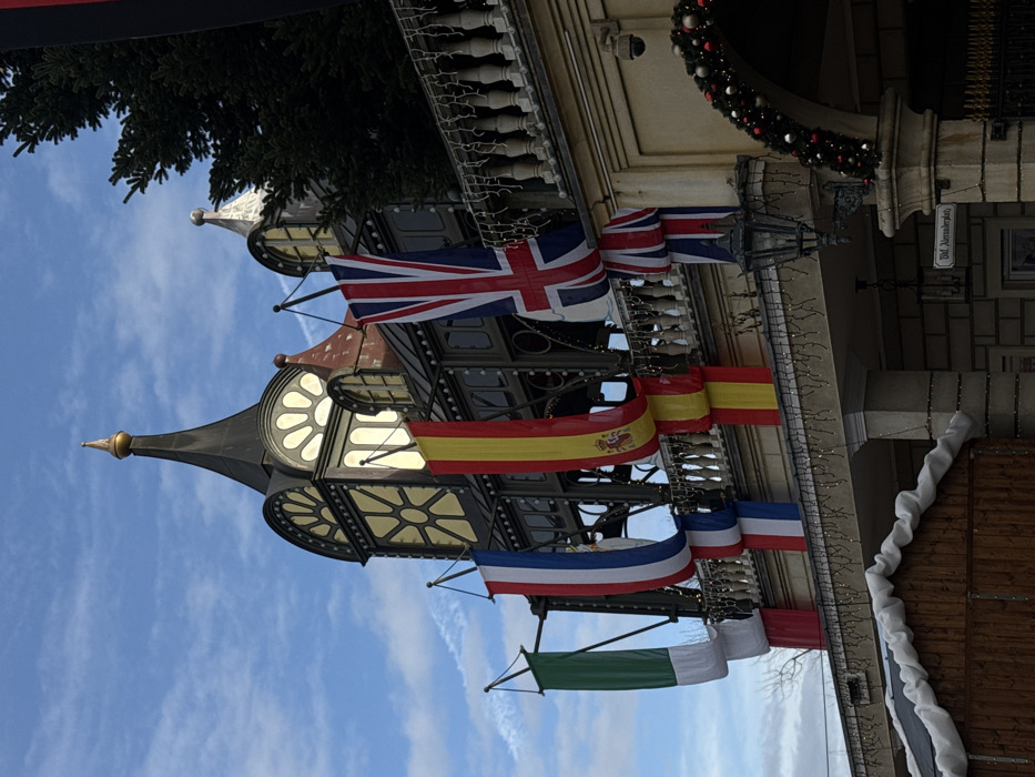 The image displays a multi-story building facade located within Europa-Park, Rust, Germany, identifiable by a "Bhf. Alexanderplatz" street sign. The upper section of the building features a black conical roof crowned with a golden finial, alongside arched windows with radiating spoke designs. A balcony railing below is adorned with five vertically draped national flags: Italy (green, white, red), France (blue, white, red), Spain (red, yellow, red, with emblem), and the United Kingdom (Union Jack). The fifth flag on the far right is partially obscured. White string lights are visible along the balcony railing and the facade. An ornate black street lamp extends from the wall beneath the balcony. To the right, an arched entranceway is decorated with a Christmas garland featuring red and silver ornaments. In the lower left, a wooden market stall with a white, undulating roofline simulating snow is partially visible. The background consists of a blue sky with scattered wispy clouds and a dark green coniferous tree. No human subjects are present. The scene reflects a decorated, festive environment during daytime.