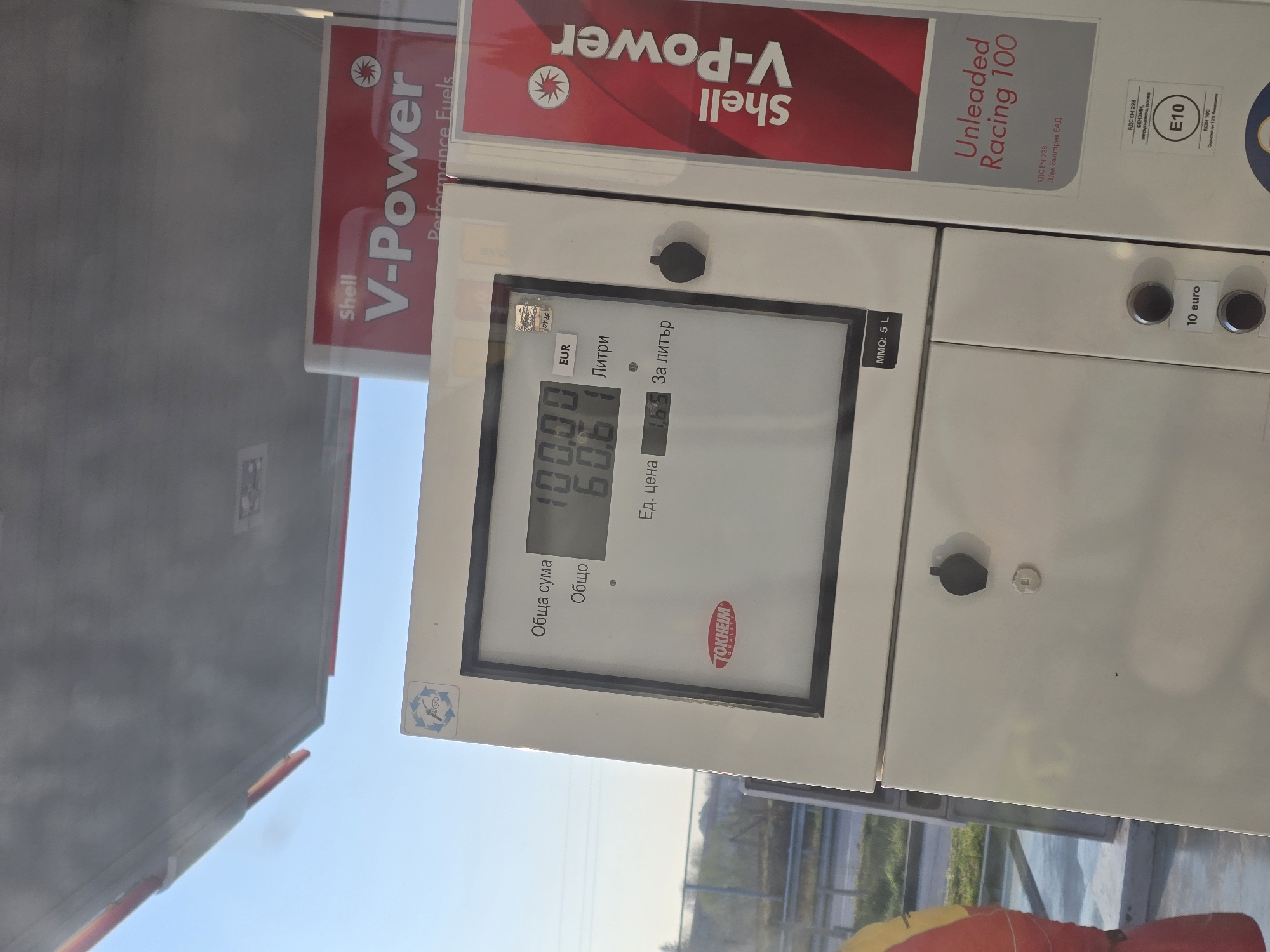 The image depicts a Shell fuel dispenser located in Hadzhidimitrovo, Bulgaria, under a gas station canopy. The white-colored Tokheim brand dispenser prominently displays a digital screen showing "Обща сума" (Total sum) of "100.00 EUR" and "60.61 Литри" (Liters). The "Ед. цена" (Unit price) is indicated as "1.65 За литър" (Per liter). Adjacent to the display, a vertical red panel features "Shell V-Power Performance Fuels" branding, with "Unleaded Racing 100" and an "E10" sticker visible below. The dispenser also shows "Шел България ЕАД" (Shell Bulgaria EAD) on a label. Two black circular buttons labeled "10 euro" are present on the lower part of the unit. The upper left portion of the image reveals a clear blue sky and the underside of the canopy. In the blurry background to the left, a road with a guardrail, green vegetation, and utility lines can be discerned. A person's arm, clad in a red and yellow jacket, is partially visible on the far left of the frame, near the base of the dispenser.