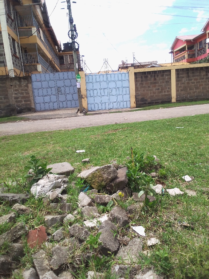 This image depicts an exterior scene in Nakuru, Kenya, viewed from a low angle across a grassy area. In the foreground, a substantial pile of fragmented concrete and masonry rubble, including a single red brick, rests on unkempt green grass interspersed with small broadleaf plants. Several pieces of white paper debris are scattered on the ground amidst the grass and rubble. The midground features an unpaved dirt path that extends horizontally across the frame. To the left of this path, a light-brown wooden utility pole, secured with multiple black wires, insulators, and a cylindrical transformer, stands upright. A small green rectangular sign is affixed to the pole. Adjacent to the pole, two light-blue metal gates, each featuring a repetitive grid of raised square patterns, provide access through a perimeter wall. The perimeter wall, primarily composed of dark grey concrete blocks, has a yellow-painted coping and is topped with multiple strands of razor wire. In the background, to the left, a multi-story residential building with yellow and grey painted sections and multiple balconies is visible, its own surrounding wall also fortified with razor wire. To the right, a portion of another residence with a distinct red tiled roof and a pink-orange exterior is discernible. The sky above is partly cloudy. No individuals are visible. A small, light-colored, amorphous object is present at the base of the utility pole, its nature indeterminate.