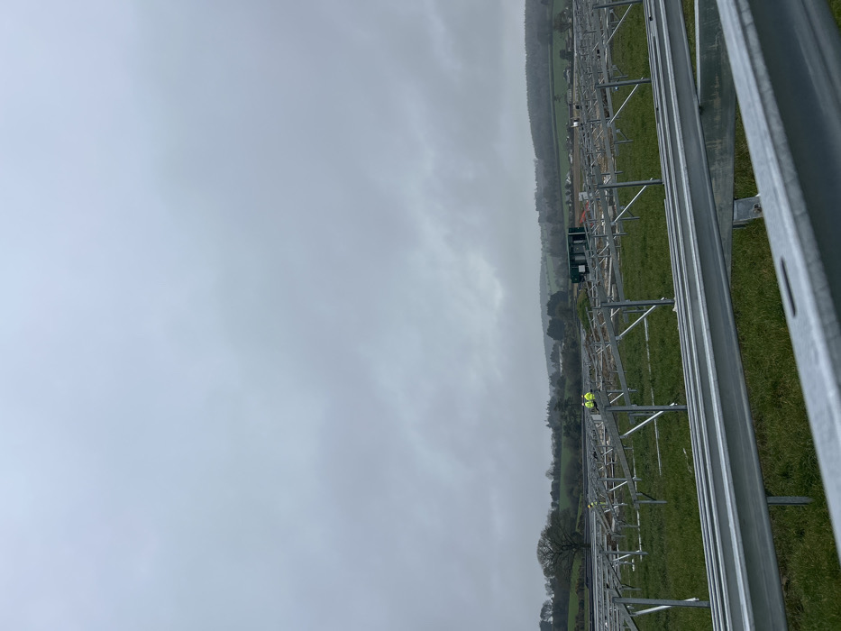 The scene is an outdoor construction site for a solar farm in Ballinvalley Lower, Ireland, under an overcast, light grey sky