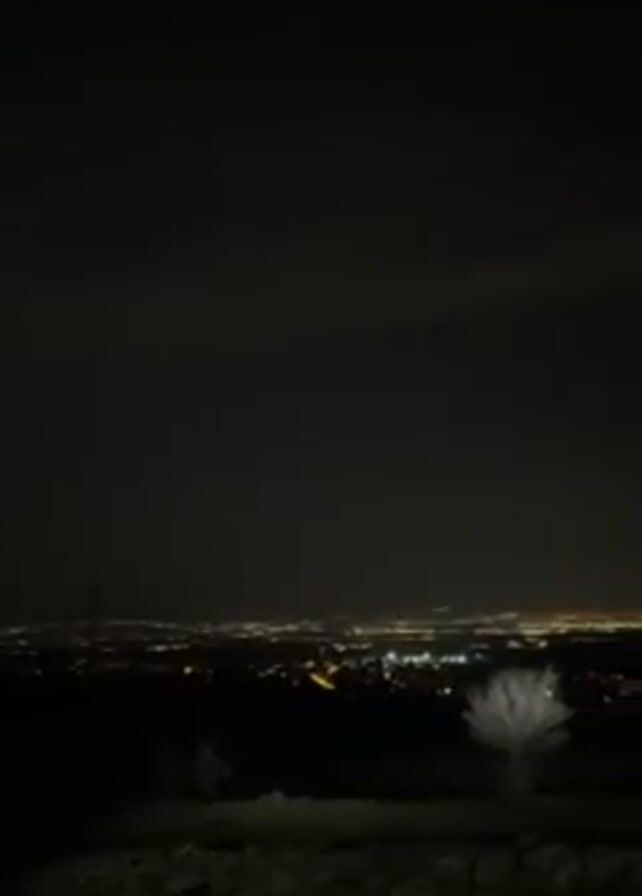 nighttime view of a city from a high vantage point. The city lights are visible in the distance, creating a bright line against the dark landscape. In the foreground, there is a tree with white bark, illuminated by an unseen light source. A child speaks softly, although the content of the speech is unclear. The sky is overcast and dark.