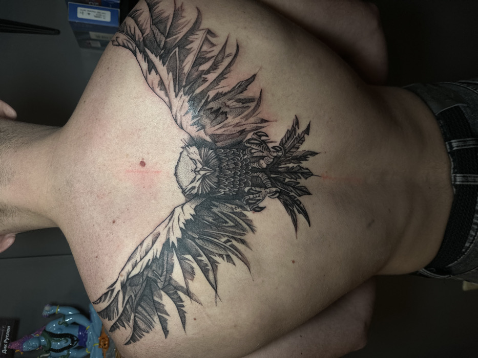 A man's back is displayed, adorned with a detailed black and gray tattoo of an owl with outstretched wings