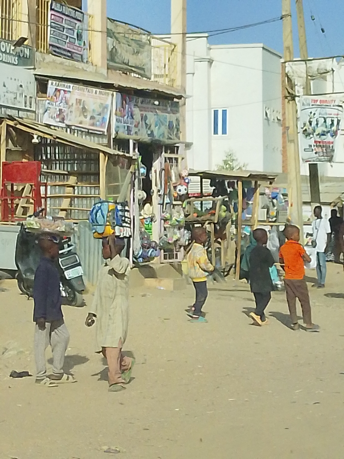 A dusty street scene showcases several young boys walking. One boy balances items on his head. The surrounding area is densely packed with small shops, displaying various goods and advertisements. A white building with two blue windows stands in the background. Utility poles are also visible. The overall atmosphere suggests a bustling, lively street in a developing area.