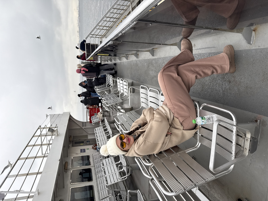 An overhead view captures a female individual seated on a passenger ferry deck in the city of Unknown, Türkiye. The subject, positioned in the foreground, wears a white knit beanie with a pompom, yellow-tinted sunglasses, a beige hooded sweatshirt, and rust-colored wide-leg pants, with tan Ugg-style boots. Her arms are crossed, and she is smiling faintly towards the camera. A green-capped plastic water bottle rests on the metallic slatted bench beside her. The ferry deck features multiple rows of similar metallic benches. In the midground, several other passengers, dressed in winter attire, stand or converse, with some observing the water. The vessel's white superstructure, including windows and an upper deck railing, is visible to the left. A metal railing with a glass barrier extends along the right side of the deck, reflecting the lower portion of the foreground subject. The environment is characterized by an overcast, grey sky. Seagulls are seen flying in the distance. The ferry is traversing a body of water with a distant shoreline exhibiting industrial infrastructure, including cranes and buildings, under the grey sky.
