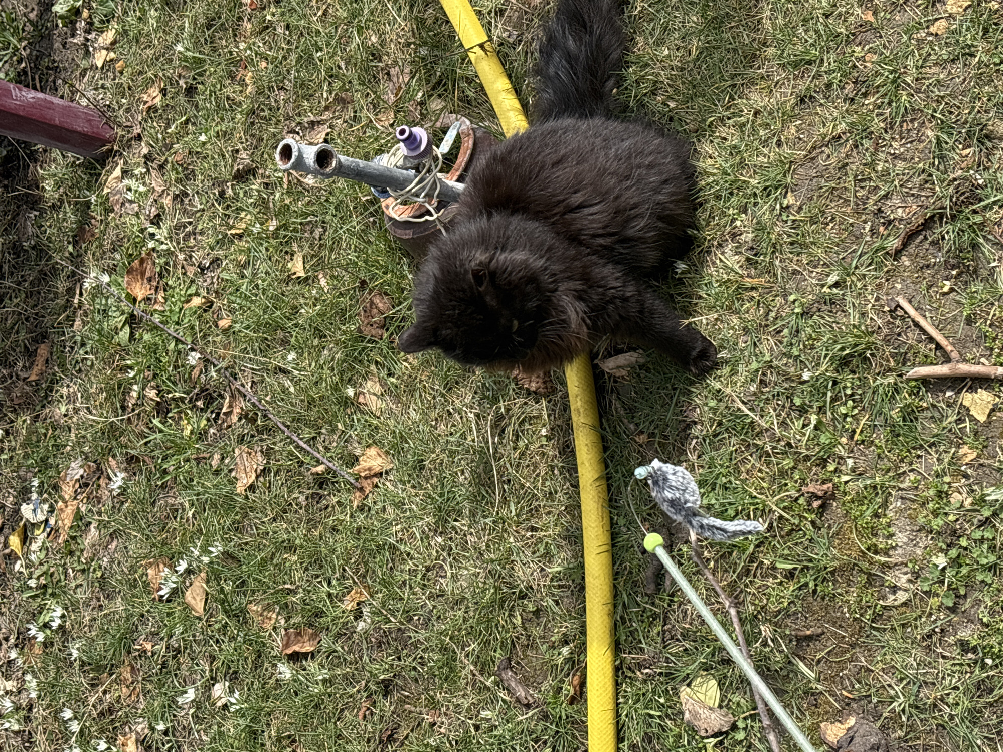 A long-haired black cat is seated on a sunlit grassy surface in Varna, Bulgaria. The cat faces towards the left side of the frame, with its dark fur appearing rich in texture. A yellow garden hose extends horizontally across the middle ground, partially behind the cat. To the right of the cat, a vertical metal pipe or post, wrapped with white string and featuring a small purple plastic connector, rises from the ground. A green and gray cat wand toy, resembling a feathered or furry lure, rests on the grass in the lower-left foreground. The ground cover consists primarily of green grass interspersed with scattered brown fallen leaves, small white flowering plants, and exposed patches of soil. A dark red wooden post is visible in the upper-right portion of the background.
