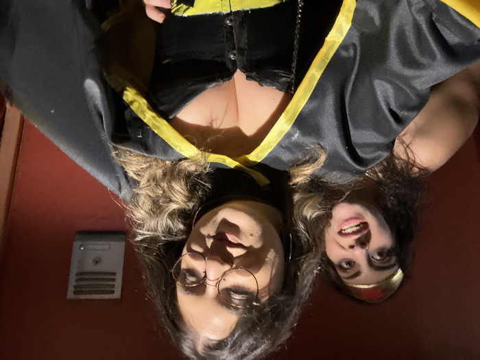 The image captures two females within an indoor environment in Naucalpan de Juárez, Mexico. The foreground subject, partially obscured, wears a black and yellow costume, consisting of a black corset-style top with yellow trim, a black cape with yellow lining, and a chain detail. She has long, wavy brown hair, wears round-framed glasses and large hoop earrings. Her eyes are lowered, and a faint smile is present. Her right hand rests near her hip. Positioned behind and to the left, the second subject wears a golden headband with a red star emblem, suggesting a Wonder Woman costume. Her dark, wavy hair is visible, and her facial expression is characterized by an open mouth with bared teeth, indicating a grimace or snarl. The background features a solid dark red wall. Mounted on the upper right portion of the wall is a silver rectangular unit with horizontal vents and a circular button or indicator.