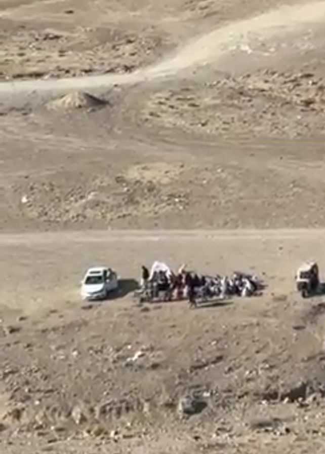 The video opens with a wide shot of a barren, mountainous landscape. In the foreground, a group of people are gathered near a white car and a small, three-wheeled vehicle. They appear to be interacting with an assortment of items spread on the ground. The camera then tilts upwards to reveal a broader view of the area, showing a city in the distance under a clear blue sky. The foreground is dominated by rocky terrain, providing a high vantage point over the surrounding landscape.