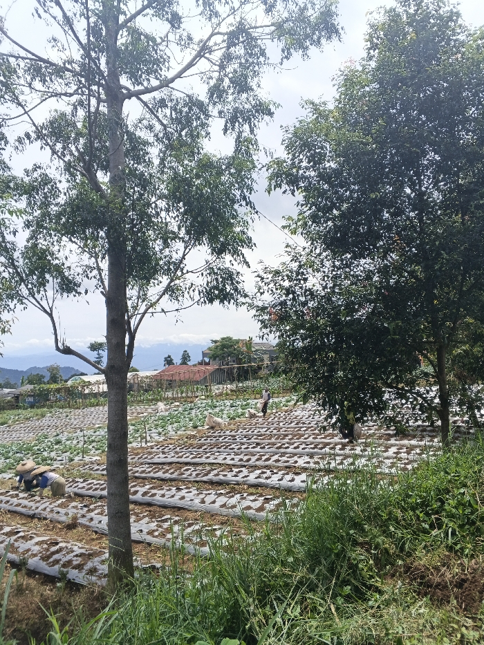 The image presents an agricultural scene in ឃុំ ផាត់សណ្ដាយ, Cambodia, under an overcast sky. In the immediate foreground, a dense patch of green grass and weeds is visible. The midground features an extensive cultivated field with numerous parallel raised beds, uniformly covered with light-colored plastic mulch film. Small, dark green plants are visible on many of these beds, indicating recent planting or early growth. Towards the upper-left of the field, an area of larger, mature green leafy crops is evident. Four individuals are dispersed across the field, engaged in agricultural work. Two individuals in the lower-left are observed bent over, wearing conical straw hats, actively tending to the crops. Two additional figures are present further right in the midground, one standing and one bent over, with one appearing to be handling a white sack. Several large white sacks or bundles are scattered throughout the field. A tall, slender tree with sparse green leaves stands prominently in the left-center of the frame, and a tree with denser foliage is positioned on the right edge. The background reveals a residential area with multiple structures, some featuring red-tiled roofs, set against a backdrop of distant, hazy mountains or hills.