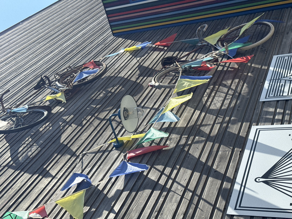 Two bicycles and a lamp are mounted on a wooden wall, decorated with a string of colorful triangular flags. A striped panel sits atop the wall. Two framed white signs with black geometric designs are placed on the wall. Sunlight casts strong shadows across the scene.