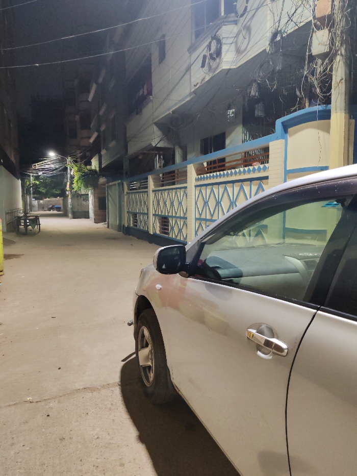 A nighttime photograph captures a narrow, concrete urban street scene in a residential area of Dhaka, Bangladesh. A silver four-door sedan is parked on the right, with its front passenger side, wheel, side mirror, and part of the door visible in the foreground, casting a shadow to its left. On the right side of the street, a multi-story building with a light-colored facade features a distinctive white fence with light blue diamond patterns, extending along a low wall. Above this, a balcony with similar blue and white railing is visible, where items of clothing are hanging. Numerous black electrical and communication wires are densely bundled and strung overhead, connecting to poles and buildings. An external air conditioning unit or exhaust fan is mounted on an upper floor. The street recedes into the background, illuminated by a single, bright streetlight positioned in the mid-ground. On the left side, another building facade runs parallel to the street. Further down the left side, beyond the immediate foreground, a simple wooden bench or table is present. The sky is dark, and no individuals or active interactions are visible within the scene.