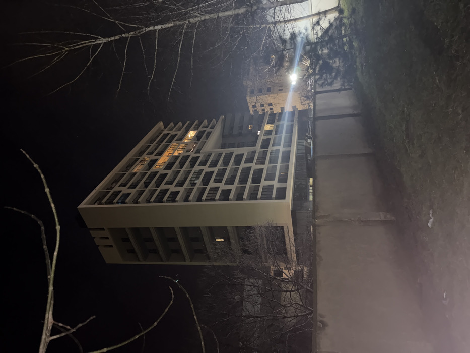 The image captures a nighttime urban scene in Varna, Bulgaria, centered on the distinctive "Capitao" building (Kaptan Residence) located at Primorski Boulevard 152. The prominent subject is a tall, multi-story, light-colored high-rise building featuring a grid of numerous balconies with dark railings. A significant rectangular architectural void is present on its right side, roughly at mid-height. Several interior windows on various floors emit a warm yellow light. To the right and partially obscured by the main structure, a second, less modern, multi-story building is visible. A sturdy, weathered concrete wall extends horizontally across the lower mid-ground, separating a dark, sparsely vegetated ground area in the immediate foreground. Bare tree branches are present in the upper left, right, and across the top of the frame, indicating a leafless season. A bright, artificial light source on the ground level to the right generates a prominent lens flare. No individuals, specific actions, or interactions are visible.