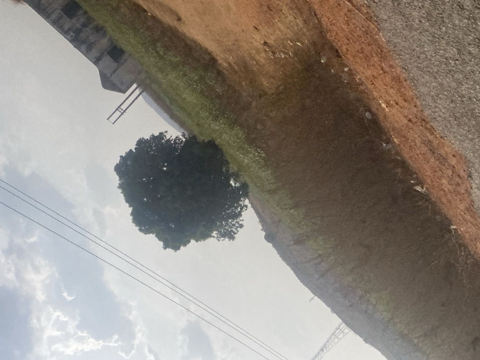 The image displays an outdoor scene in Kwali, Nigeria, captured with a diagonal horizon. The sky, occupying the upper left, is light blue with scattered white clouds and exhibits a hazy appearance. Multiple thin, dark utility lines span across the upper-left sky. A prominent, large, dense green deciduous tree stands centrally on a gentle slope that runs diagonally from the lower-left to the upper-right of the frame. This slope is covered by a mix of green and dry, light brown herbaceous vegetation. In the upper-right, on the slope, an aged, light-colored (off-white or light grey) building with darkened rectangular openings and a darker roofline is visible. Adjacent to this structure, two dark, vertical posts, potentially utility poles, are present. In the far lower-left, a section of a metal lattice transmission tower is observed. The foreground in the lower-right consists of a reddish-brown dirt or unpaved area that borders a darker grey-black paved surface, consistent with a roadway. Scattered light-colored debris, possibly plastic, is visible along the edge where the unpaved area meets the vegetation in the lower-right. No individuals or specific actions are depicted.