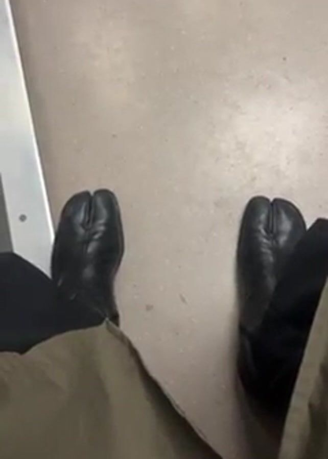 person sitting down, wearing black leather Tabi boots. The person is wearing light green pants. The floor appears to be a concrete or tile surface with some speckled details. A metal bar is visible on the left side of the frame. The background is not clearly visible. There is audio of a train.