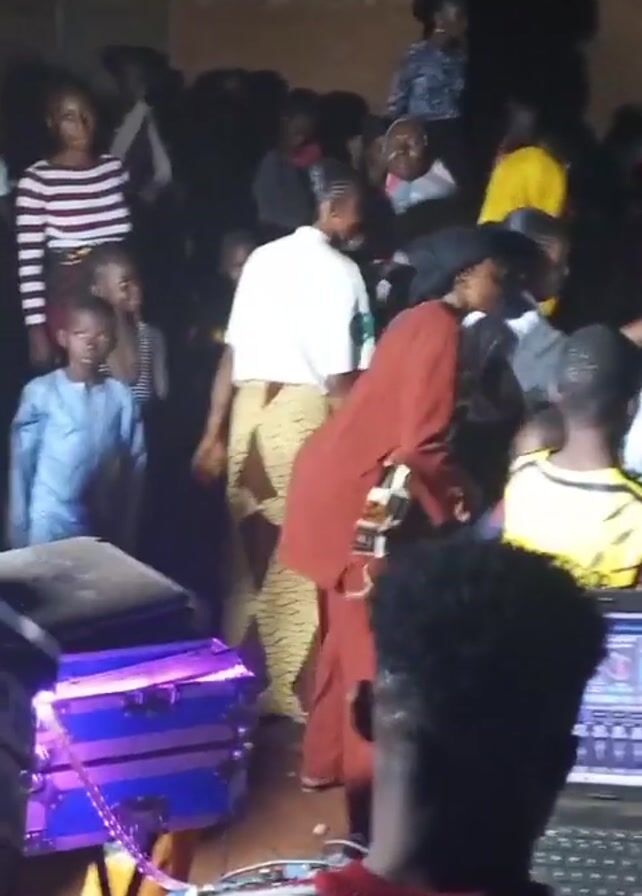 crowd of people dancing at an outdoor event. A DJ stands in the foreground, facing the crowd, with a laptop displaying audio software visible on the table in front of them. The people in the crowd are of various ages and are wearing a mix of casual and dressy clothing. Some women wear head coverings. The background is dark, suggesting the event is at night, and there are some buildings visible in the distance. The lighting is poor, but a case illuminated with purple light sits on the table near the DJ. The overall atmosphere suggests a lively and social gathering with music and dancing.