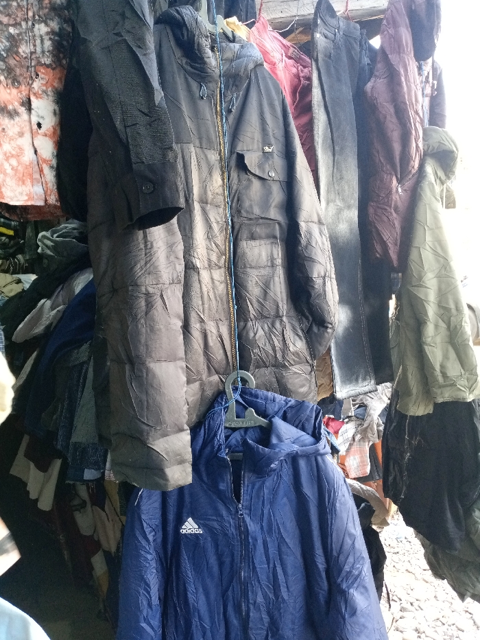 The scene depicts an outdoor market stall in Maiburiji, Nigeria, displaying an assortment of used outerwear garments